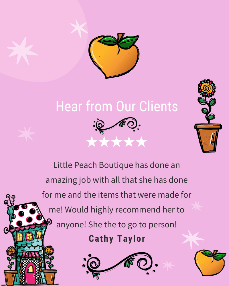 Little Peach Boutique was started as a hobby because I wanted to create all the cute personalized things I saw for my daughters and family. I started sewing and machine embroidery. Then I got into sublimation and other styles of printing. I truly have my DREAM JOB!! To make things sweeter I now get to create for my Granddaughter who keeps me inspired!!